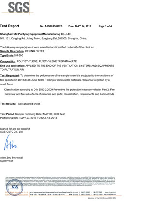 上海禾益净化设备制造有限公司过滤棉阻燃SGS报告